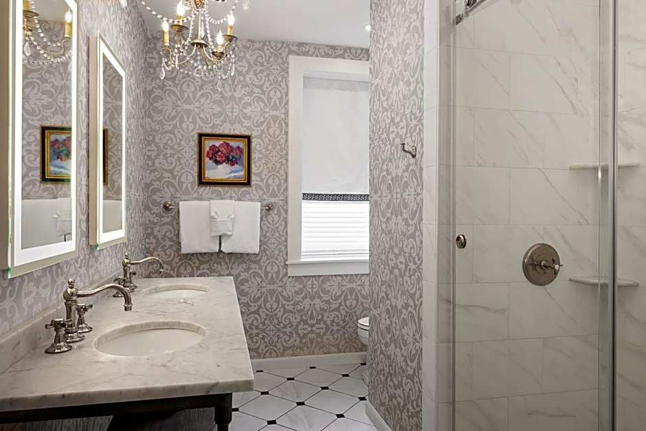 This suite features two 4-post beds, a sitting area with a fireplace, and a view of Lafayette Square. The en suite includes a marble walk-in shower and double vanity. This room is on the 4th floor and is a two-flight walkup.